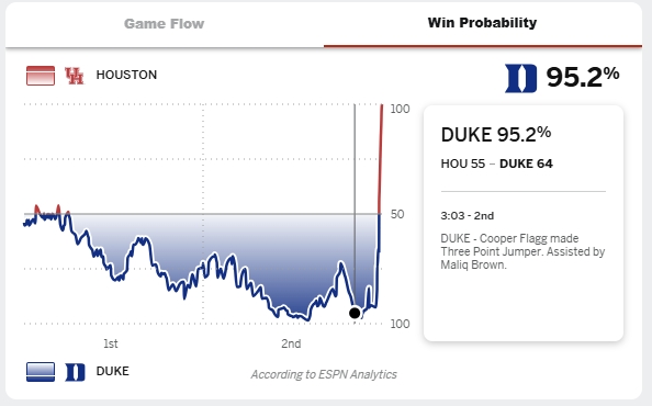 ESPN数据显示,终场前3分03秒,杜克以64-55领先,当时他们的胜率高达95.2%,但随后蓝魔进攻断电!最后33秒,休斯敦轰出9-0进攻高潮极限翻盘。